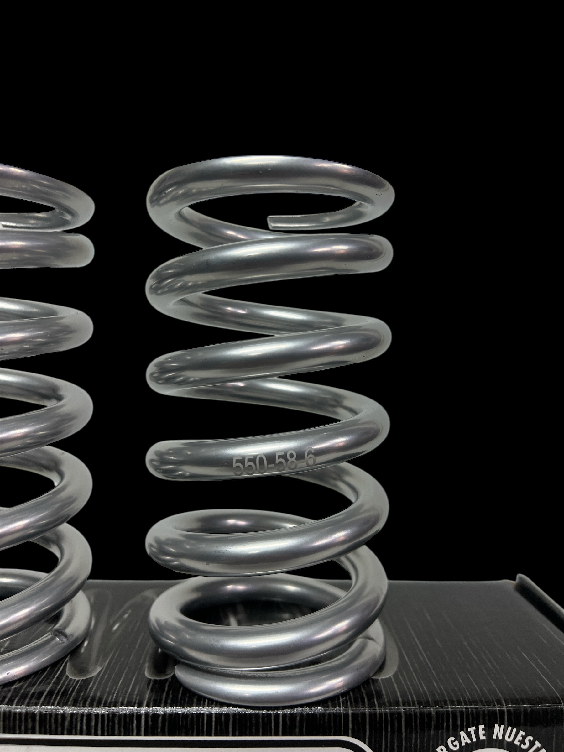 Lbs/inch: 550 Kg/cm: 98 Ø Interior: 58mm / 2,25” Largo: 150mm / 6”” Peso por resorte: 1,3 kg Peso total en caja: 3 kg